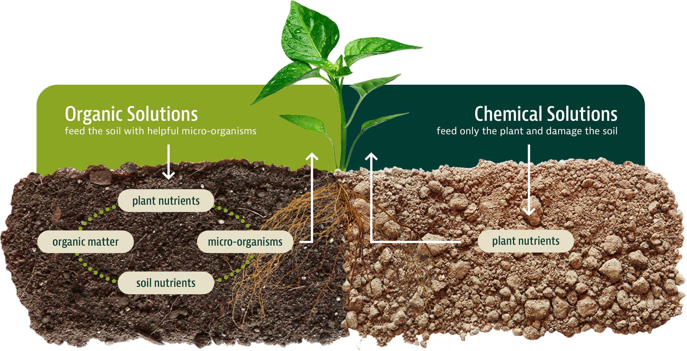 Most home gardeners agree that soil is essential, but they often overlook that most products at garden centers don't improve it. John & Bob's promotes soil-based gardening over chemical-based gardening. Chemical feed plants directly with products like Miracle-Gro and other popular fertilizers. These products don't improve your soil and result in the need for more chemicals, getting you stuck in an endless cycle of chemical inputs, which only make your soil worse.